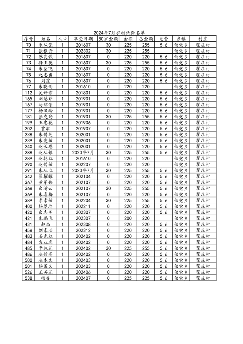 伯党乡翟庄村2024年7月份农村低保人员名单
