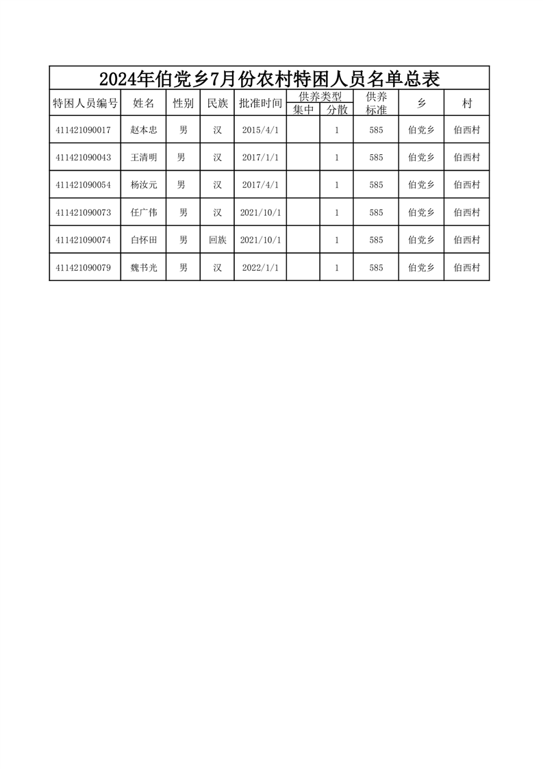 伯党乡伯西村2024年7月份农村五保人员名单