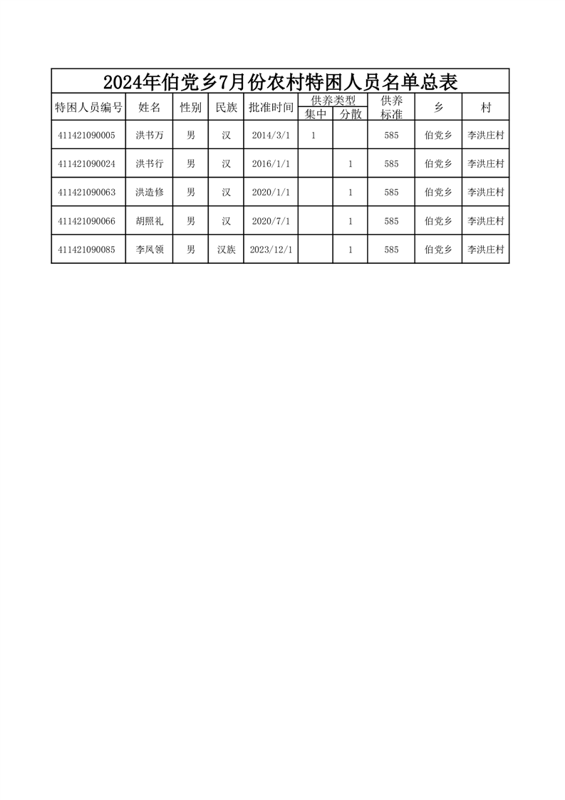 伯党乡李洪庄村2024年7月份农村五保人员名单