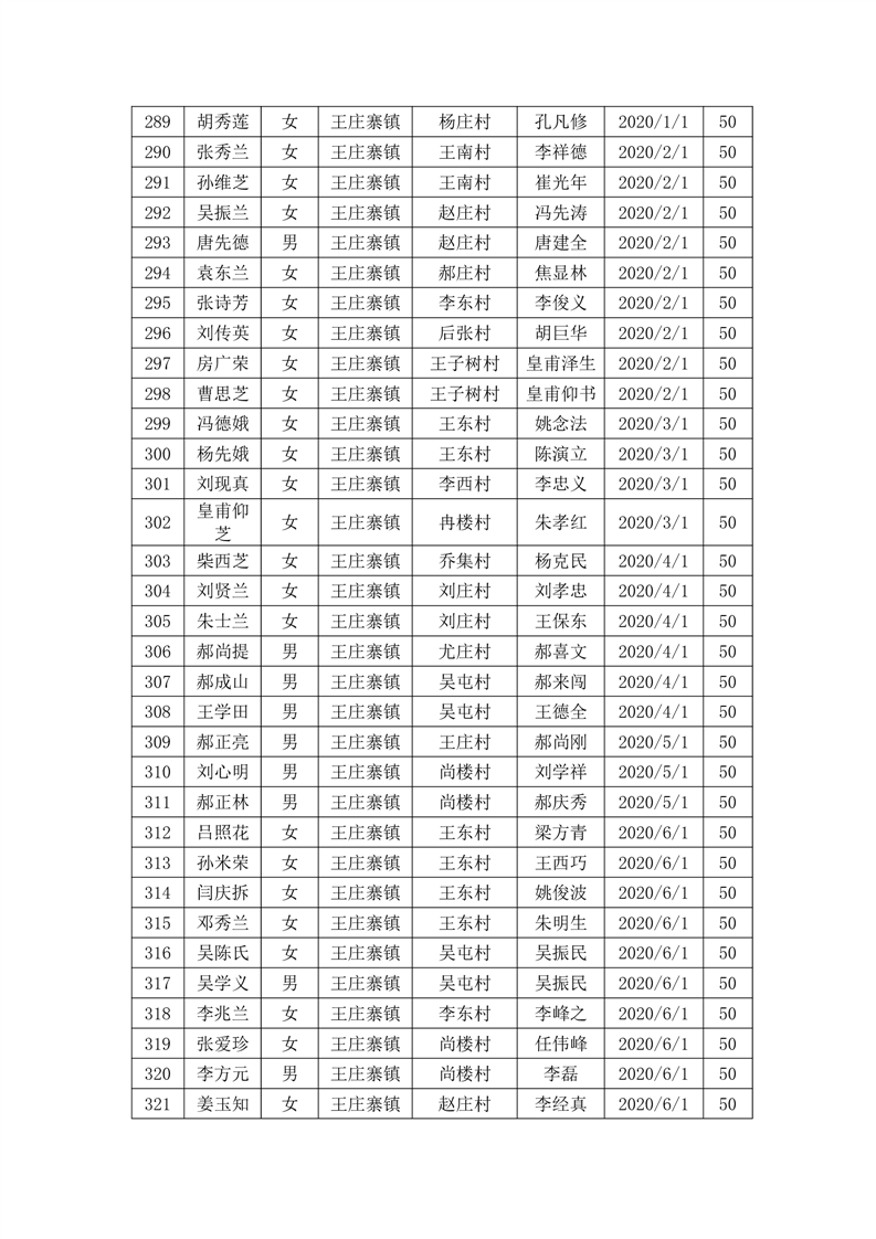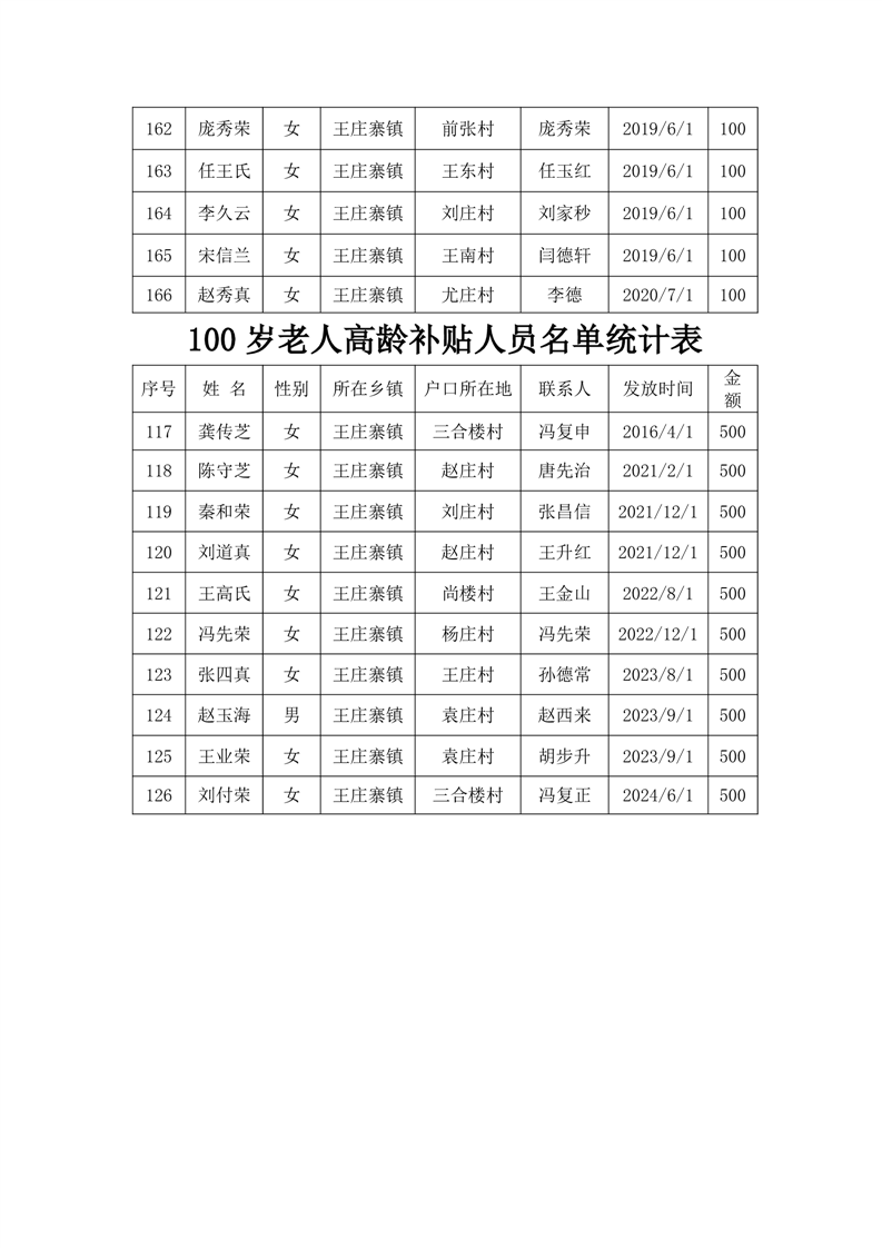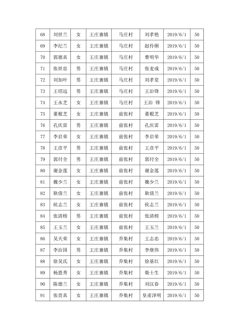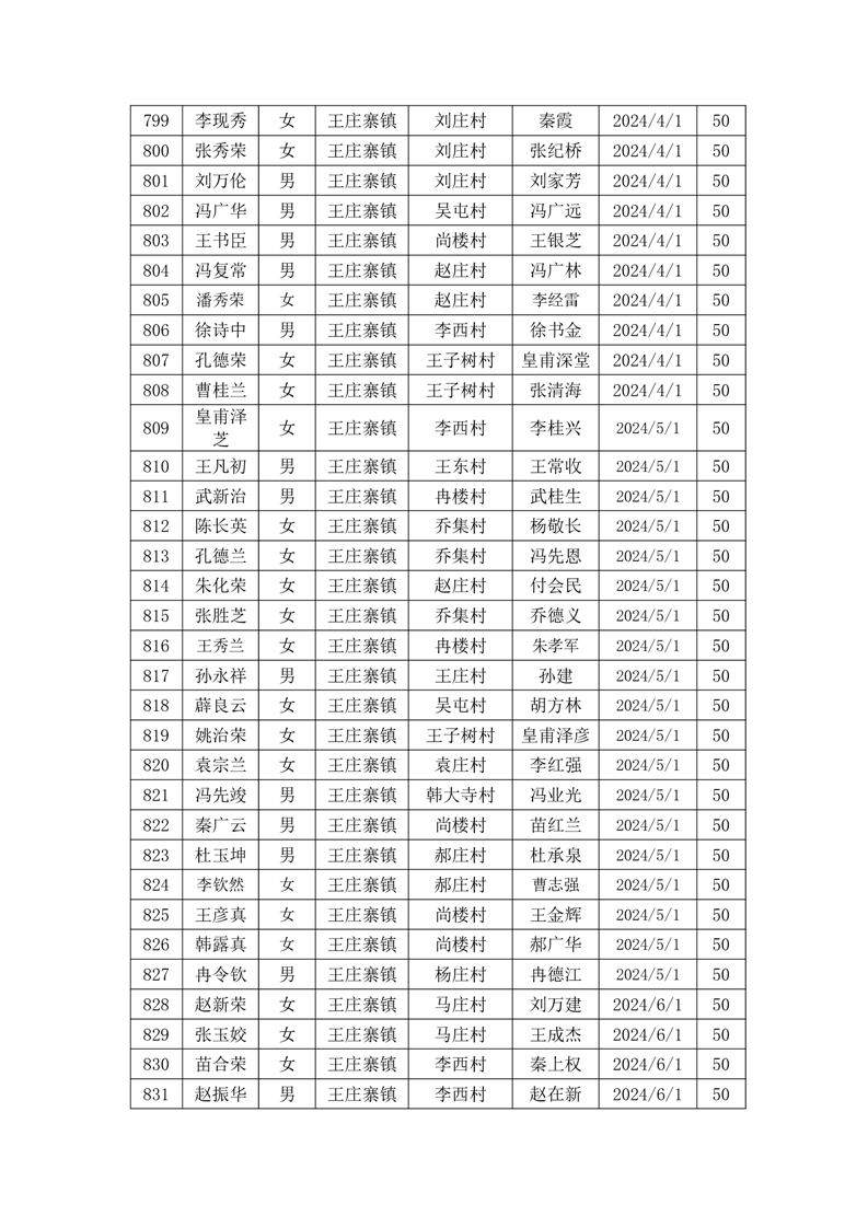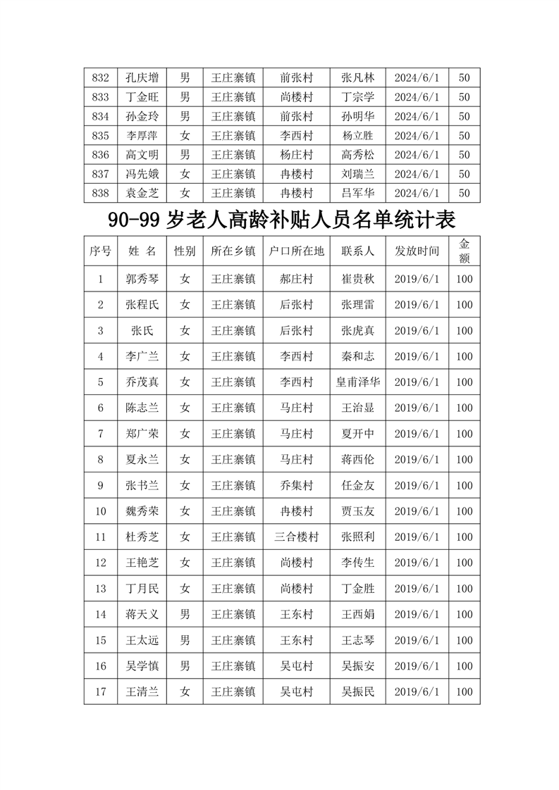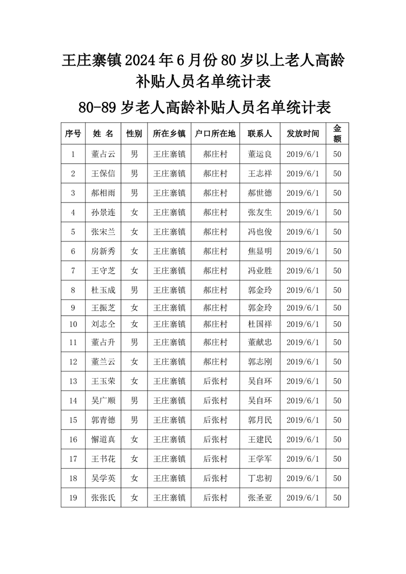 王庄寨镇2024年6月份80岁以上老人高龄补贴人员名单统计表