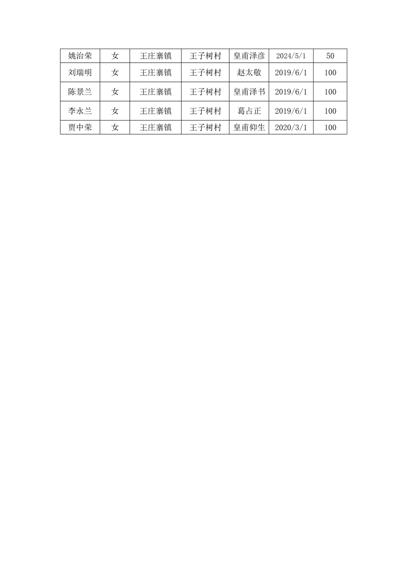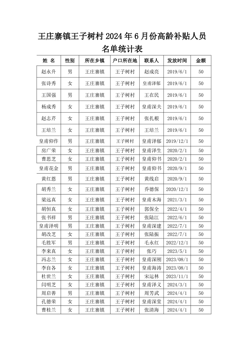 王庄寨镇王子树村2024年6月份高龄补贴人员名单统计表
