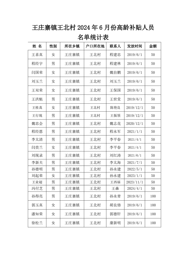 王庄寨镇王北村2024年6月份高龄补贴人员名单统计表