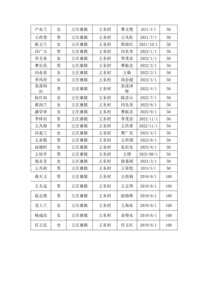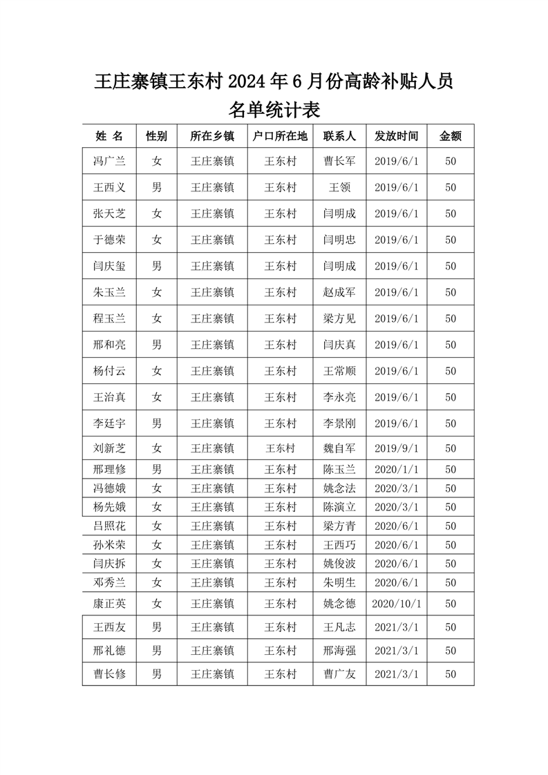 王庄寨镇王东村2024年6月份高龄补贴人员名单统计表