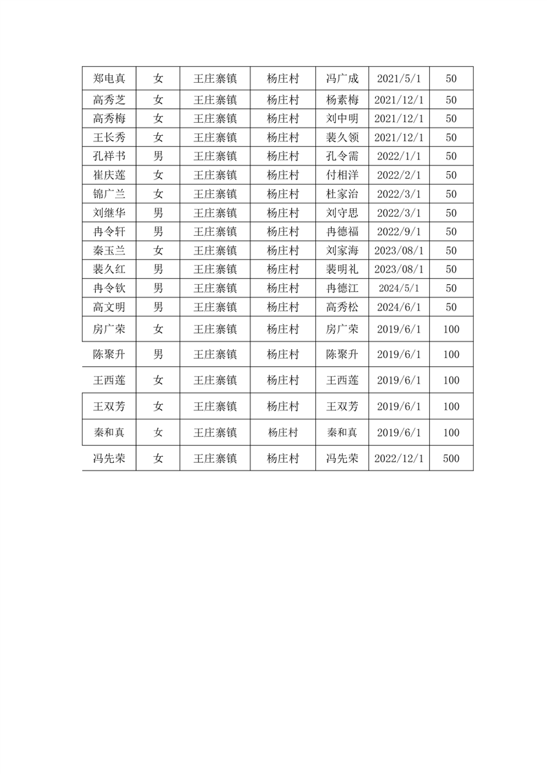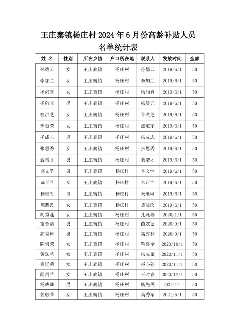 王庄寨镇杨庄村2024年6月份高龄补贴人员名单统计表