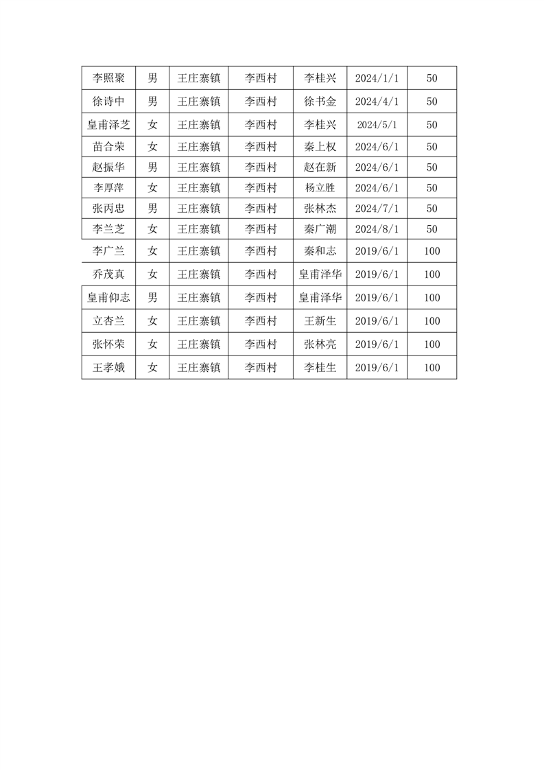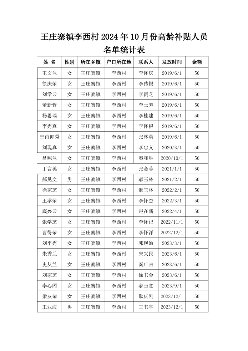 王庄寨镇李西村2024年10月份高龄补贴人员名单统计表