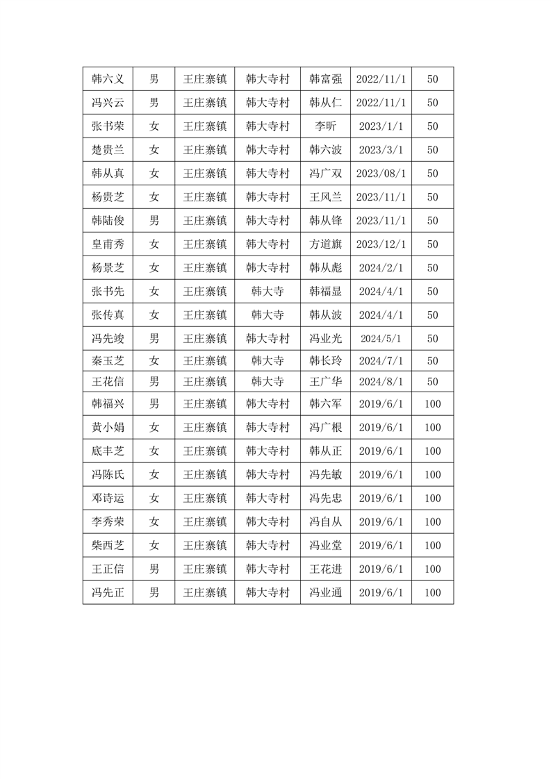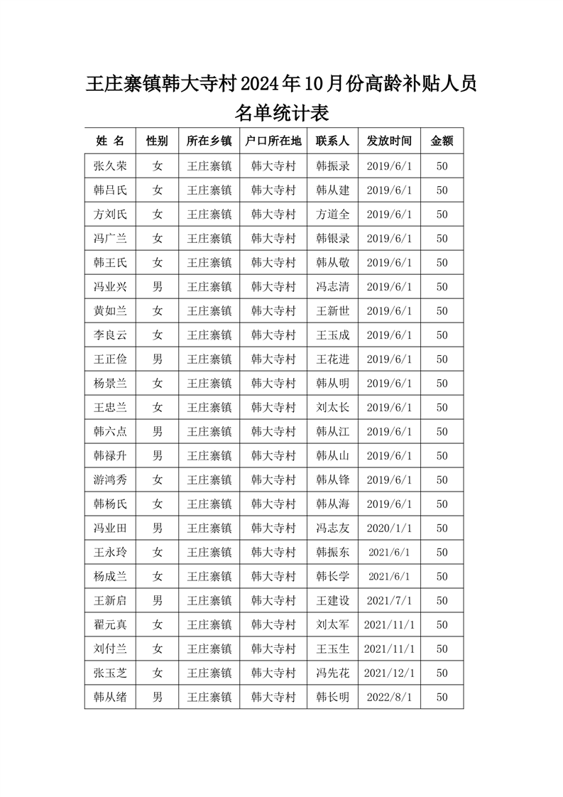 王庄寨镇韩大寺村2024年10月份高龄补贴人员名单统计表
