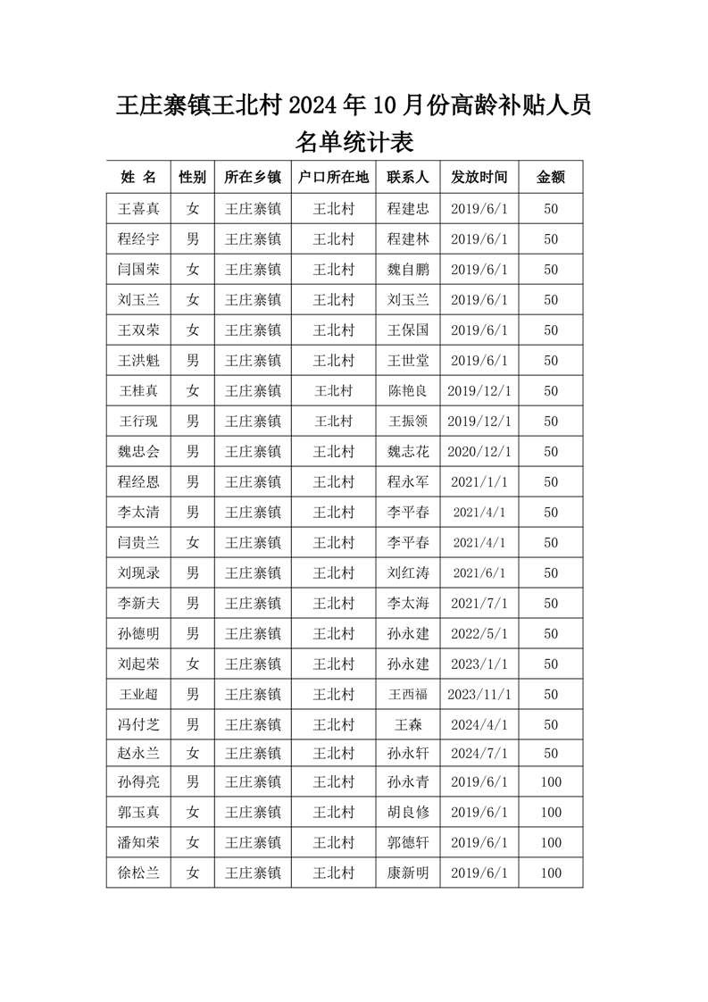 王庄寨镇王北村2024年10月份高龄补贴人员名单统计表
