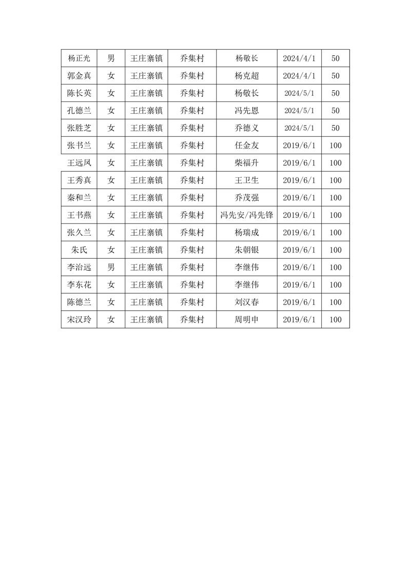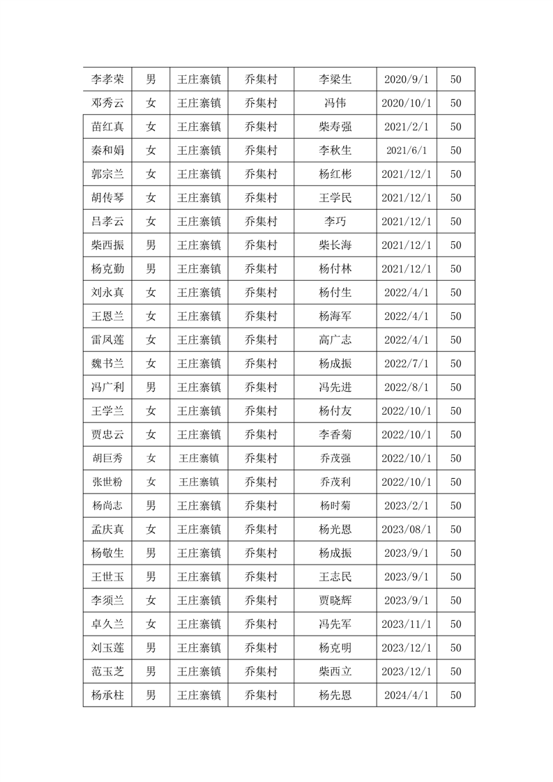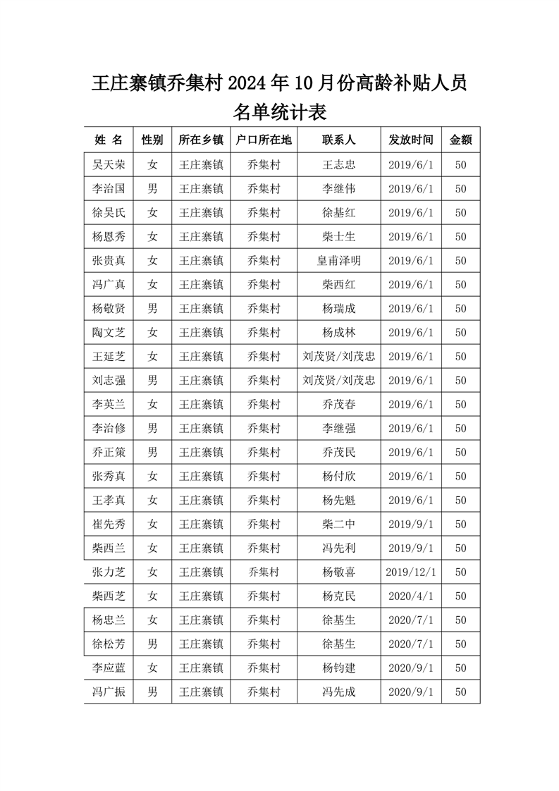 王庄寨镇乔集村2024年10月份高龄补贴人员名单统计表