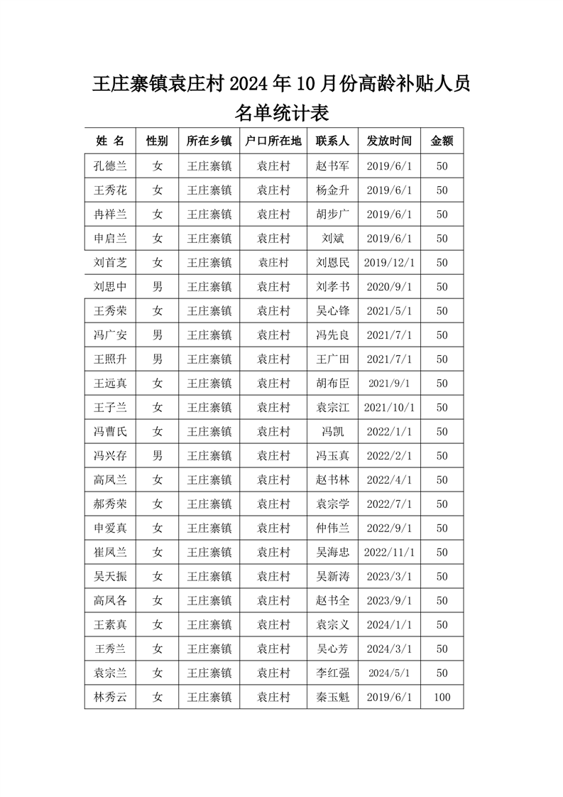 王庄寨镇袁庄村2024年10月份高龄补贴人员名单统计表