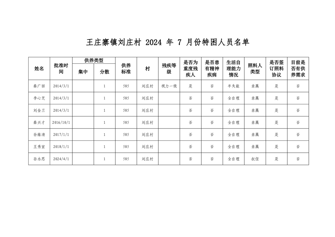 王庄寨镇刘庄村 2024 年 7 月份特困人员名单