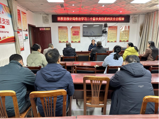 2025年1月9日,民权县统计局召开全体会议,传达学习二十届中央纪委四次全会精神,并对如何贯彻落实会议精神做出安排部署,及时跟进学习领会纪委全会精神。