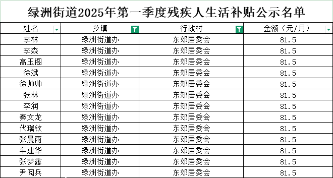 绿洲街道2025年第一季度残疾人生活补贴公示名单