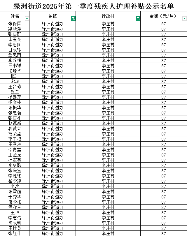 绿洲街道2025年第一季度残疾人护理补贴公示名单