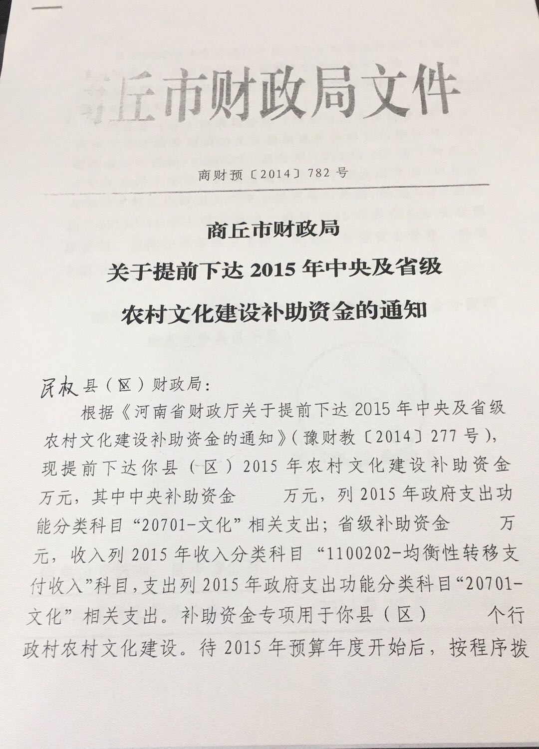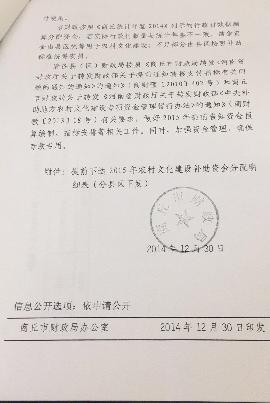 商丘市财政局关于提前下达2015年中央及省级农村文化建设补助资金的通知