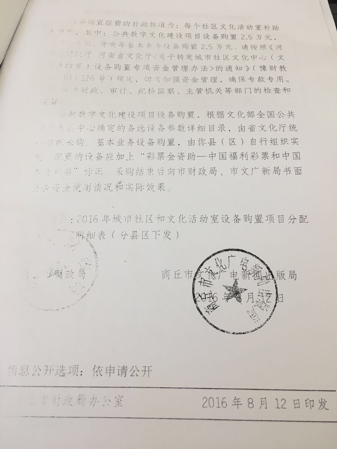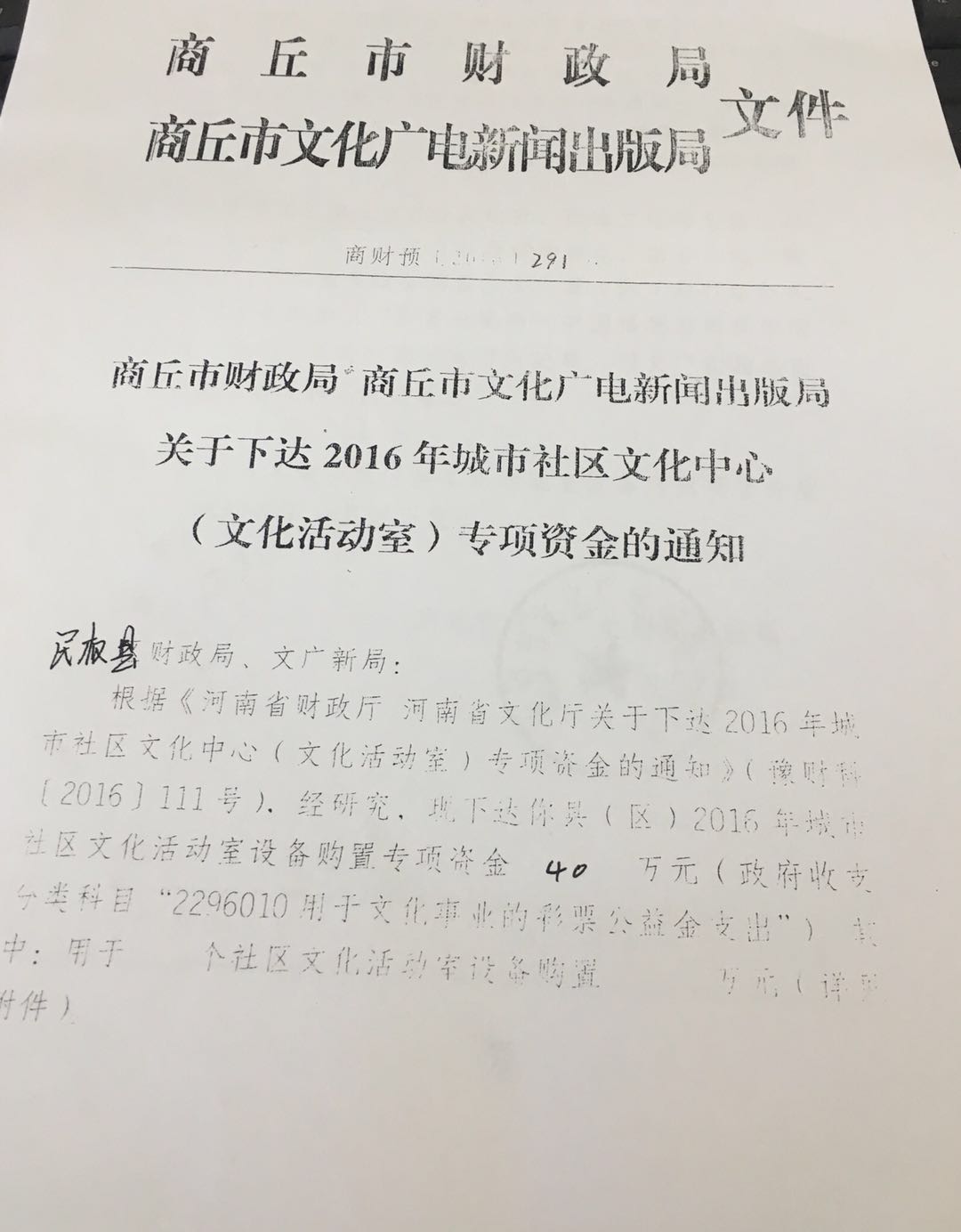商丘市财政局商丘市文化广电新闻出版局关于下达2016年城市社区文化中心(文化活动室)专项资金的通知
