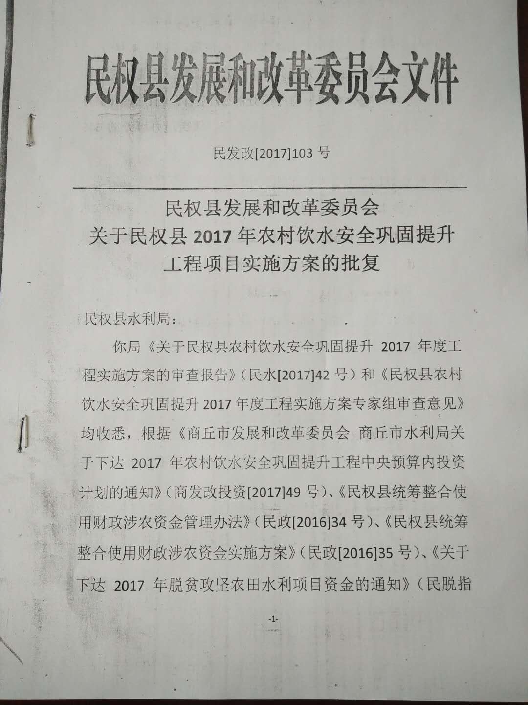 关于民权县2017年农村饮水安全巩固提升工程项目实施方案的批复