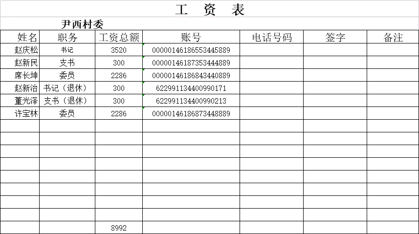 尹西村2018年第一季度村工资信息公开