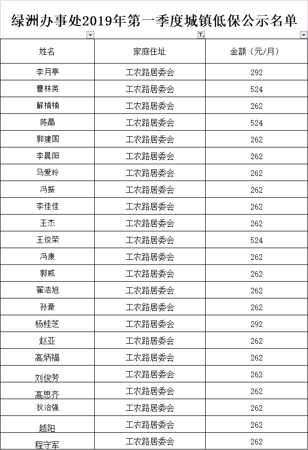 绿洲办事处2019年第一季度城镇低保公示名单