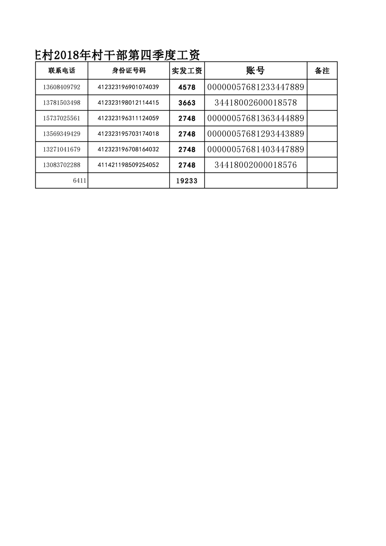 民权县王庄寨镇刘庄村2018年第四季度村干部工资表