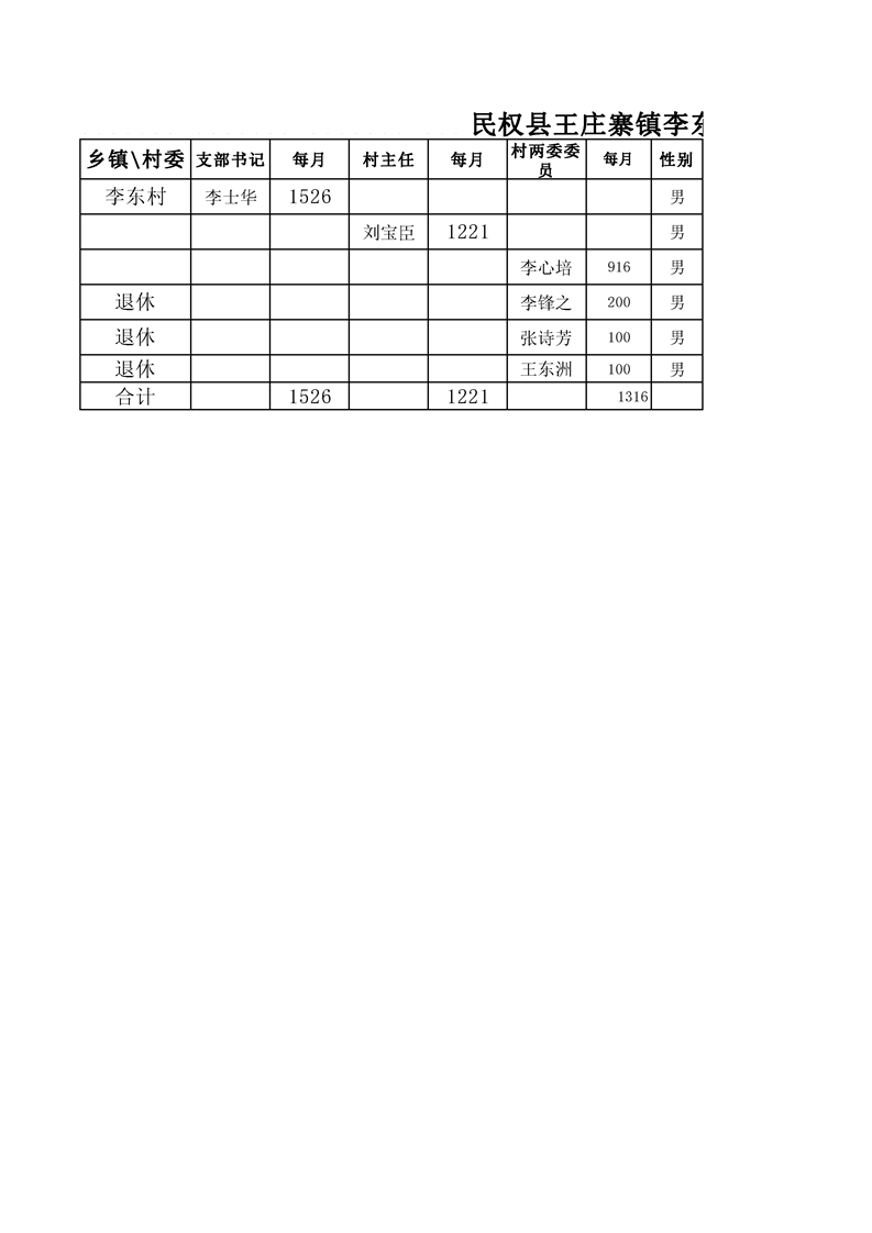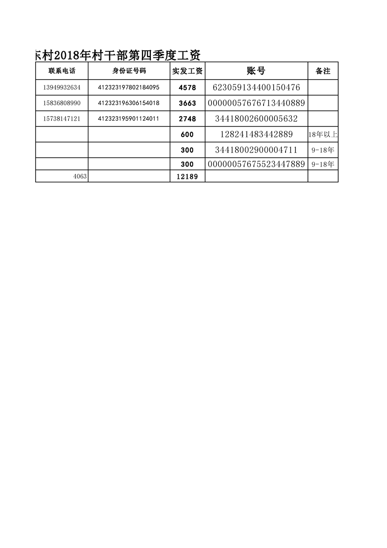 民权县王庄寨镇李东村2018年第四季度村干部工资表