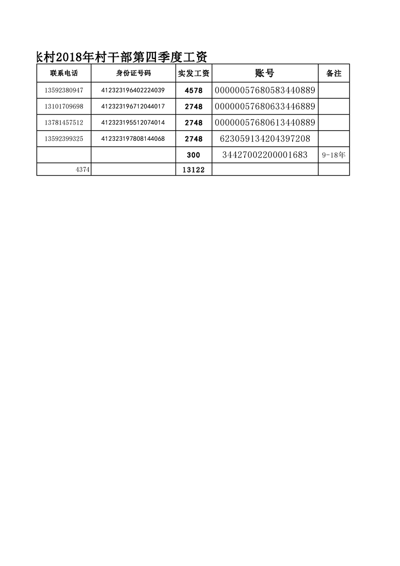 民权县王庄寨镇后张村2018年第四季度村干部工资表