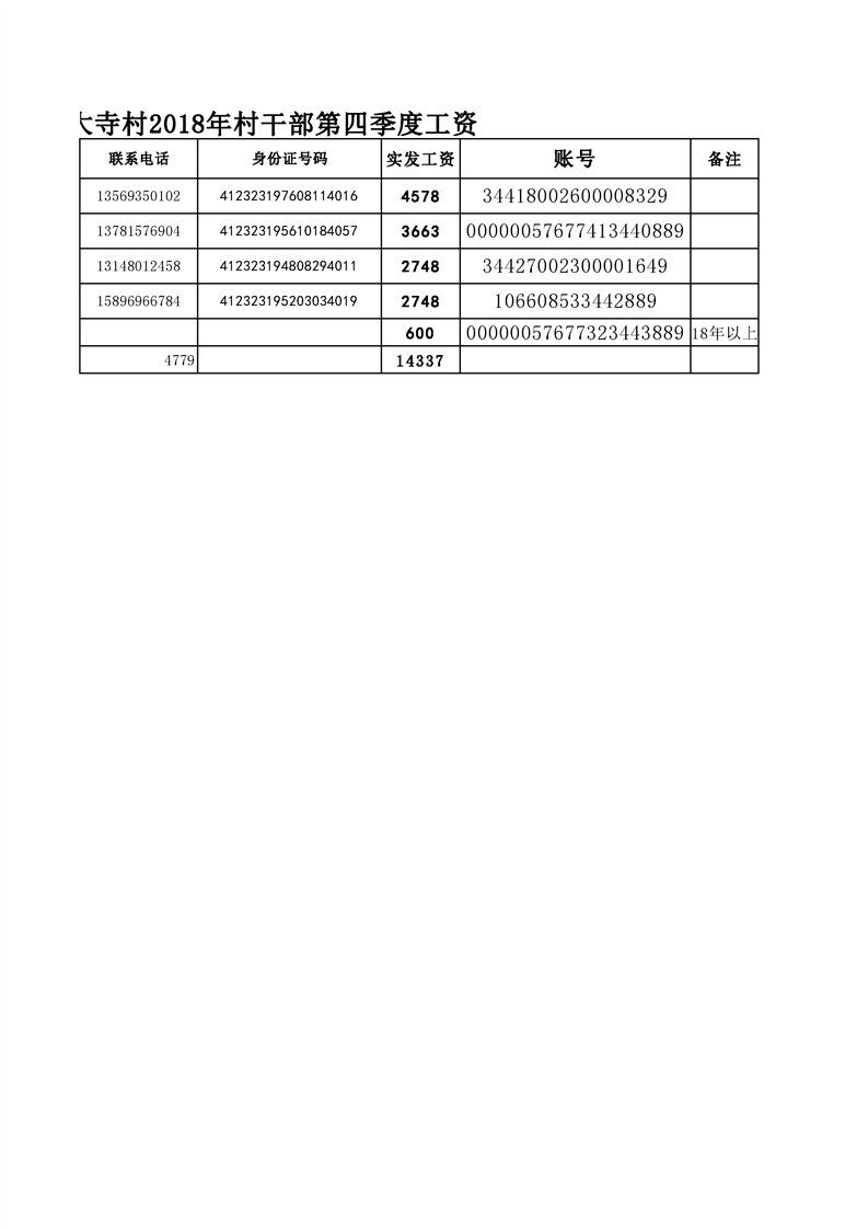 民权县王庄寨镇韩大寺村2018年第四季度村干部工资表