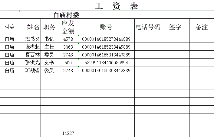 白庙村2018年第四季度工资公示
