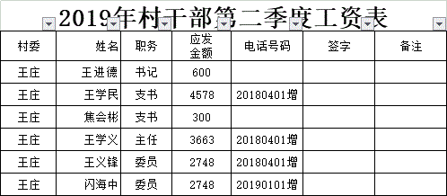 王庄村2019年村干部第二季度工资表
