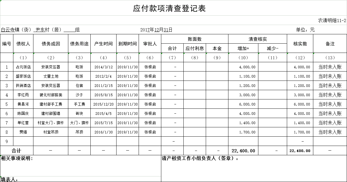 尹东村应付款项清查登记表