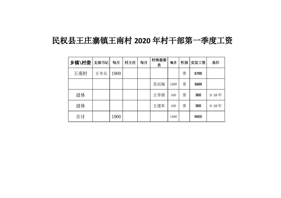 民权县王庄寨镇王南村2020年村干部第一季度工资
