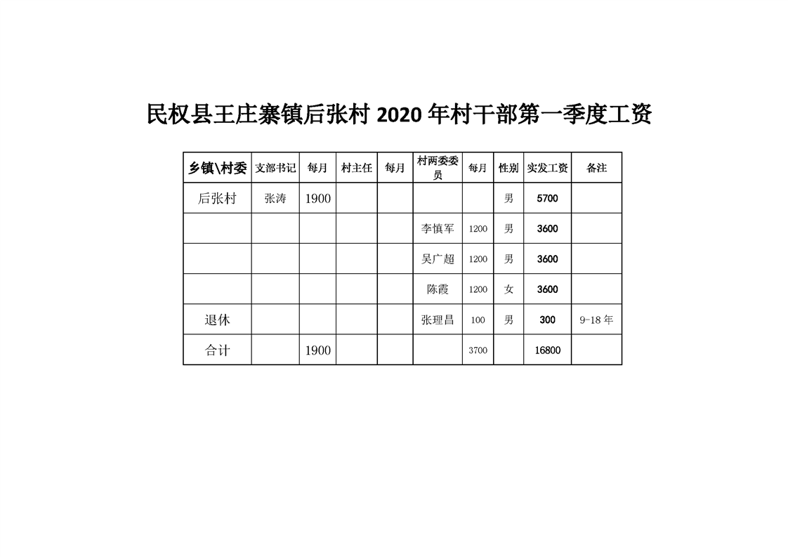 民权县王庄寨镇后张村2020年村干部第一季度工资