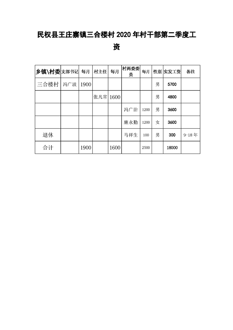 民权县王庄寨镇三合楼村2020年村干部第二季度工资