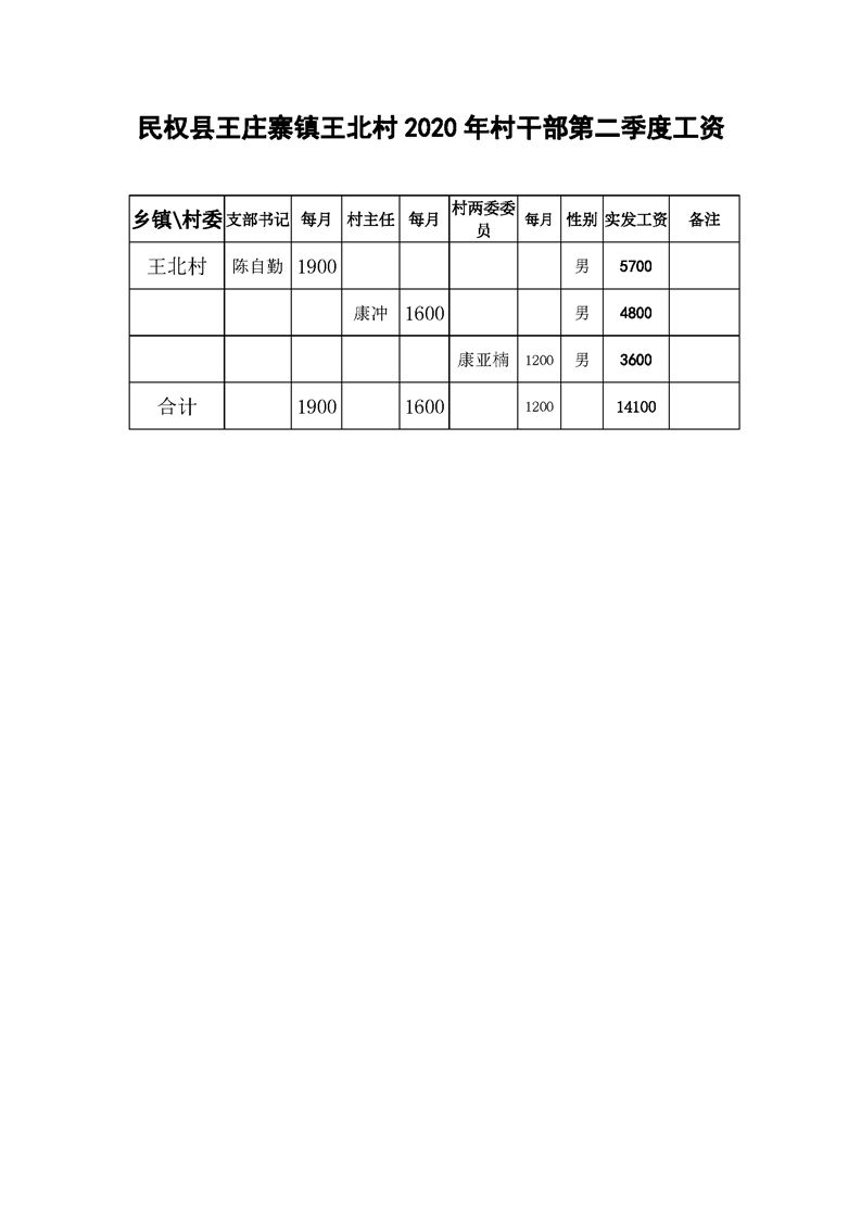 民权县王庄寨镇王北村2020年村干部第二季度工资