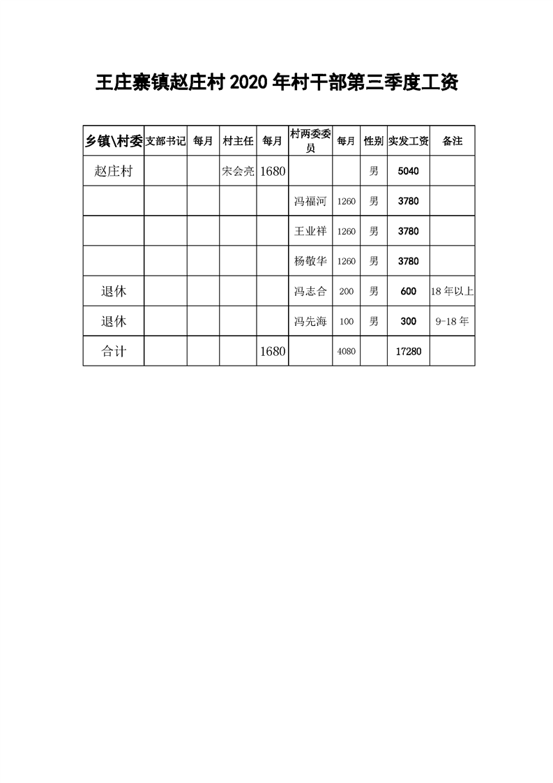 王庄寨镇赵庄村2020年村干部第三季度工资
