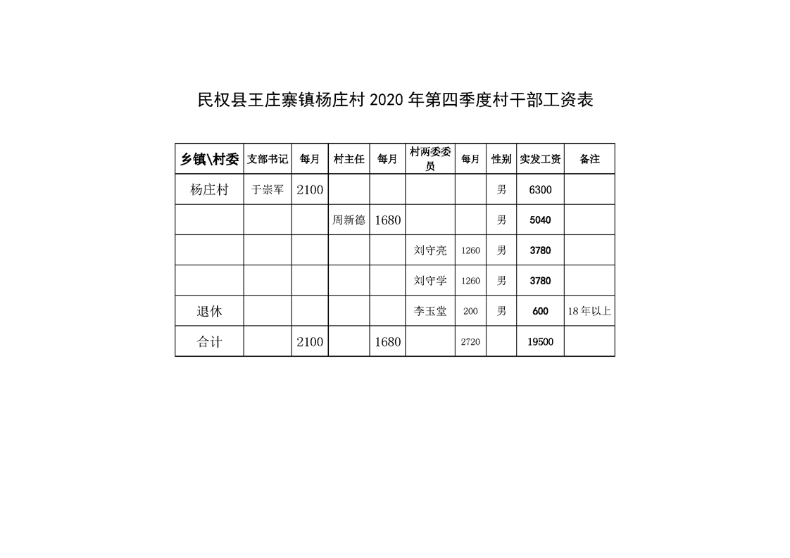 民权县王庄寨镇杨庄村2020年第四季度村干部工资表