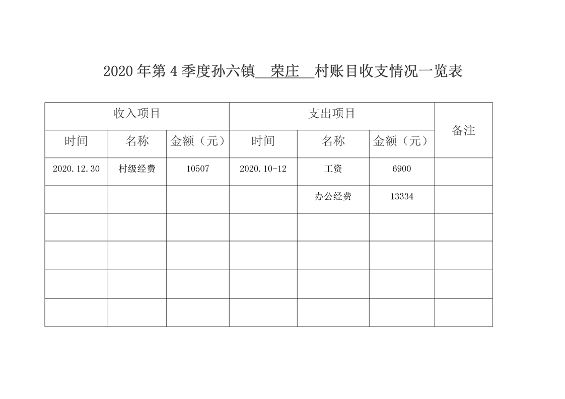 2020年第4季度孙六镇 荣庄村账目收支情况一览表