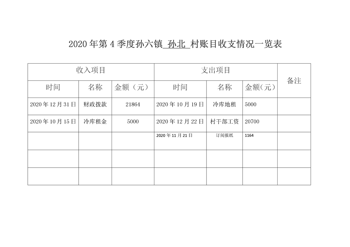 2020年第4季度孙六镇 孙北 村账目收支情况一览表