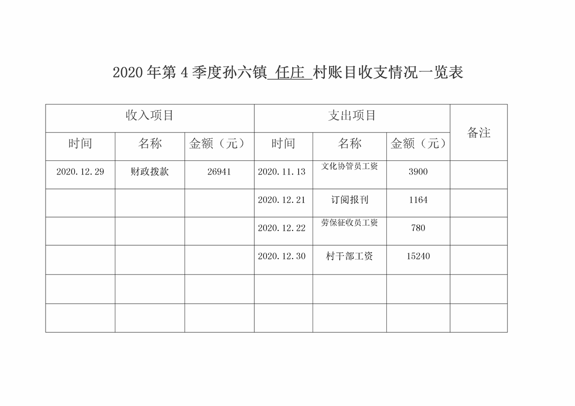2020年第4季度孙六镇 任庄村账目收支情况一览表