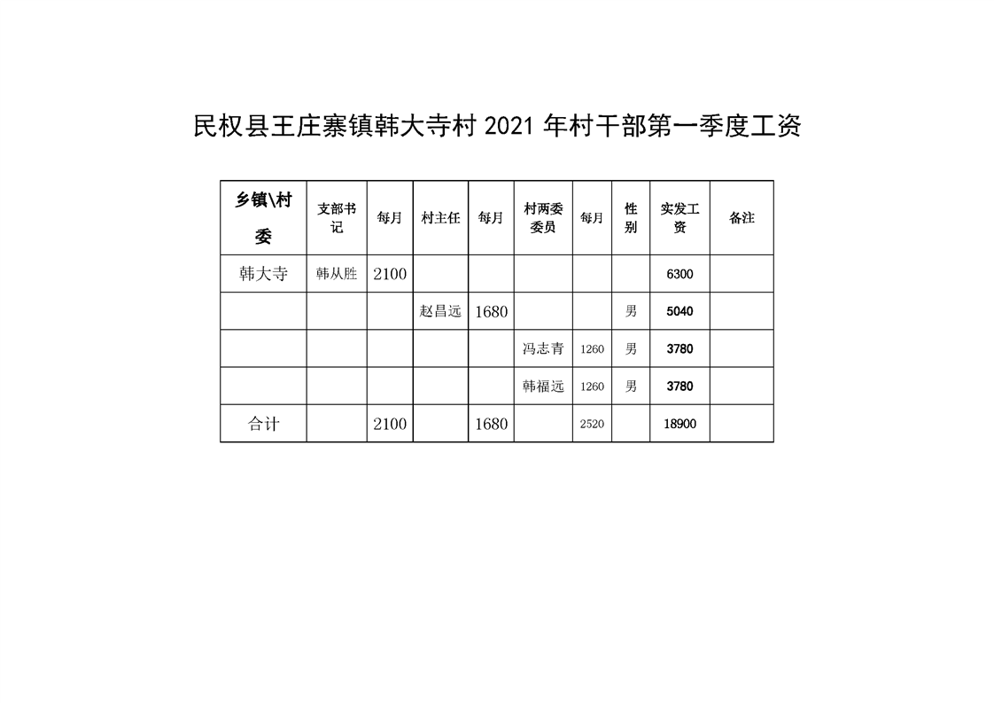 民权县王庄寨镇韩大寺村2021年村干部第一季度工资