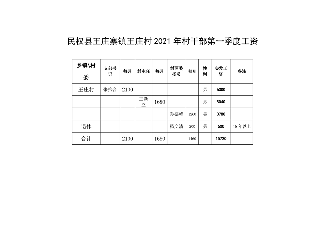 民权县王庄寨镇王庄村2021年村干部第一季度工资
