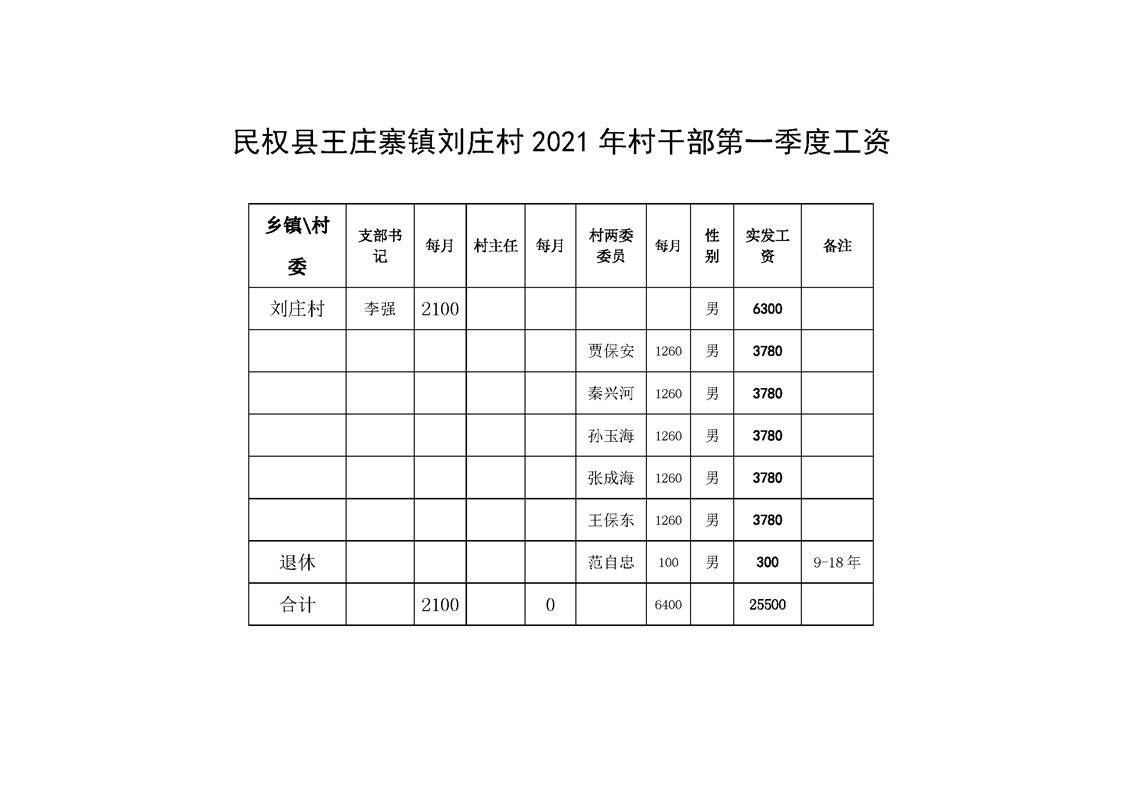 民权县王庄寨镇刘庄村2021年村干部第一季度工资