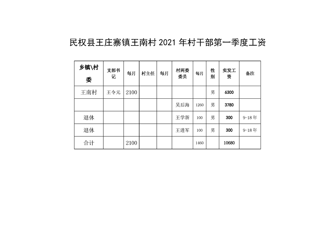 民权县王庄寨镇王南村2021年村干部第一季度工资