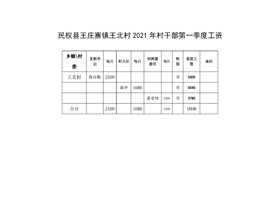 民权县王庄寨镇王北村2021年村干部第一季度工资