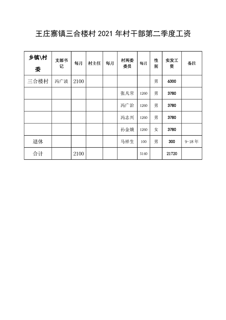 王庄寨镇三合楼村2021年村干部第二季度工资