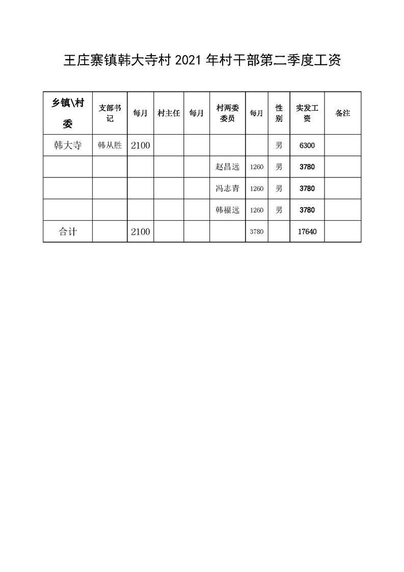 王庄寨镇韩大寺村2021年村干部第二季度工资
