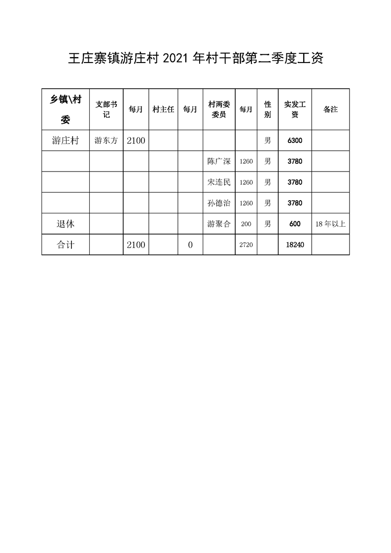 王庄寨镇游庄村2021年村干部第二季度工资