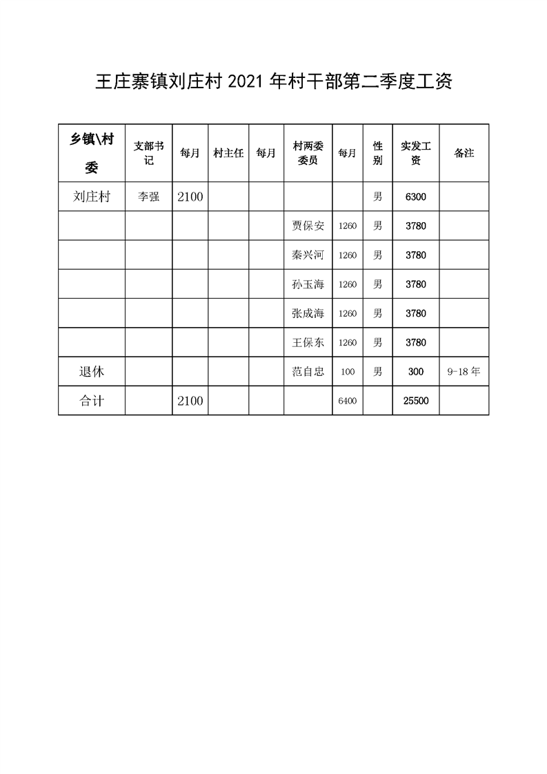 王庄寨镇刘庄村2021年村干部第二季度工资