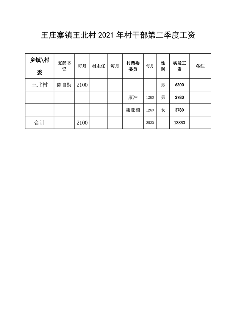 王庄寨镇王北村2021年村干部第二季度工资