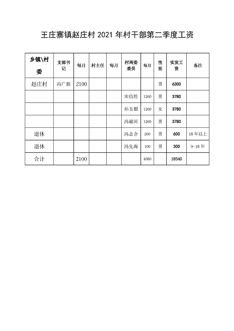 王庄寨镇赵庄村2021年村干部第二季度工资
