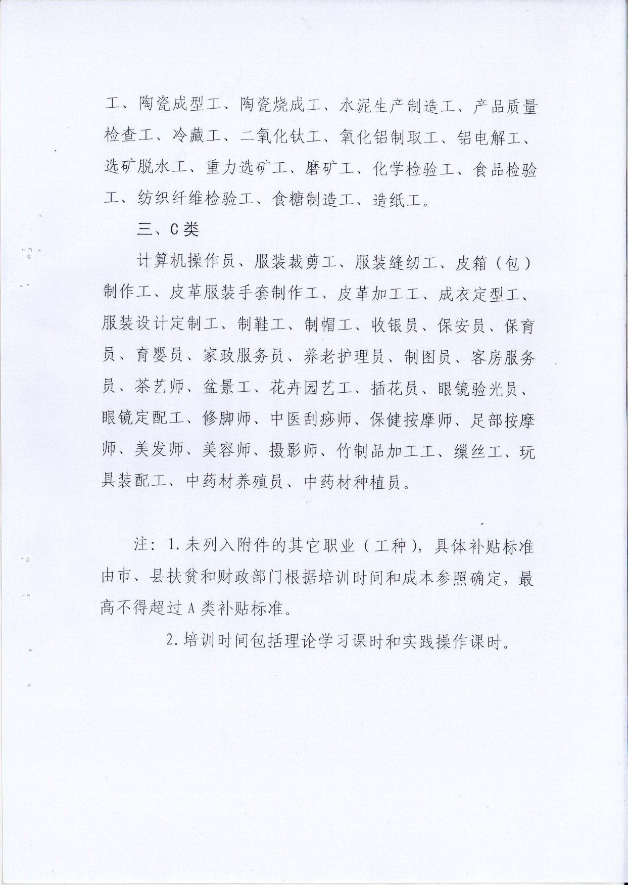 给予一次性补助,根据受训贫困劳动力取得的技能等级证书的工种分类,给予相应标准的补助: A类工种补助2000元, B类工种补助1800元, C类工种补助1500元。 |